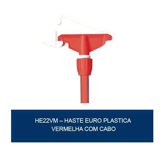 Este acessório deve ser acoplado a um Cabo de Alumínio, que pode ser fosco ou colorido conforme a sua melhor utilização. Estes cabos recebem uma pintura eletrostática que garante a sua resistência e durabilidade. A Haste Euro Plástica e o Cabo de Alumínio serão utilizados em conjunto com o Balde Espremedor para a limpeza de pisos.
