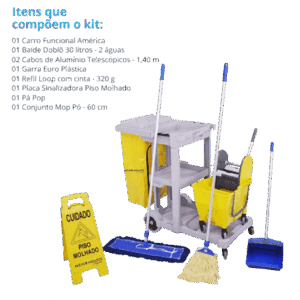 Um kit que proporciona solução completa para a limpeza de pisos frios em geral e outras superfícies. O Carro Funcional América transporta com praticidade todos os equipamentos e acessórios necessários para a limpeza do dia a dia.