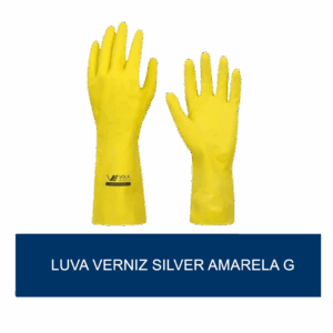 LUVA LÁTEX VERNIZ SILVER PLUS: Luva de segurança confeccionada em borracha natural e resina nitrílica, revestimento interno de Verniz Silver que proporciona menor probabilidade a alergias, superfície externa antiderrapante na palma, dedos, face dorsal e punho. Espessura de 0,45mm e comprimento de 30cm (aproximadamente). Proteção das mãos, aprovada pela Norma MT-11/1977 Agentes Químicos: Classe A – Tipo 2: Agressivos Básicos; Classe B – Detergentes, Sabões, Amoníaco e Similares; Classe C – Tipo 3: Álcoois, Tipo 4: Éteres, Tipo 5: Cetonas e Tipo 6: Ácidos Orgânicos.