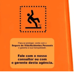 Frase da placa: “Cuidado piso Molhado. Para se preteger, conte com o Seguro de Vida/Acidentes Pessoais e garanta sua tranquilidade. Fale com o nosso consultor ou com o gerente desta agência.”