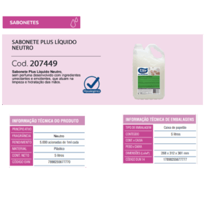 Sabonete Líquido Plus, sem perfuma desenvolvido com ingredientes umectantes e emolientes, que atuam na limpeza e hidratação das mãos.