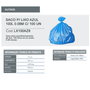 Saco para lixo Azul 100L 0.08m – Embalagem com 100un