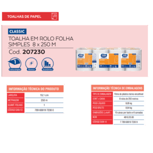 Toalha de Papel Rolo Classic Folha Simple, caixa com 2.000 metros