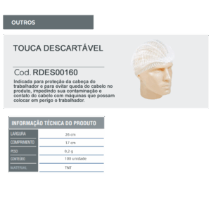 Indicada para proteção da cabeça do trabalhador e para evitar queda do cabelo no produto, impedindo sua contaminação e contato do cabelo com máquinas que possam colocar em perigo o trabalhador. Produto de amplo uso em unidades de saúde. Retirar a touca de sua embalagem e colocá-la na cabeça começando a partir da testa para a base da nuca. Adaptar na cabeça de modo confortável.